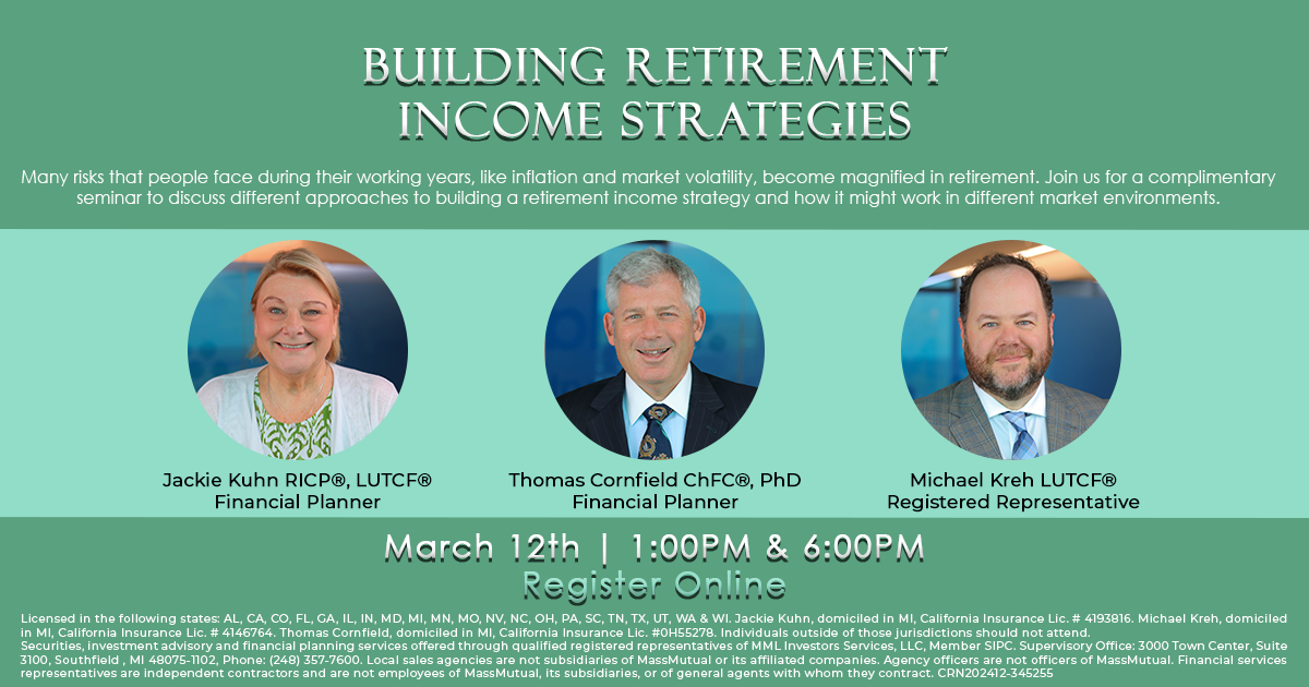 Many risks that people face during their working years, like inflation and market volatility, become magnified in retirement. Join us for a complimentary seminar to discuss different approaches to building a retirement income strategy and how it might work in different market environments.